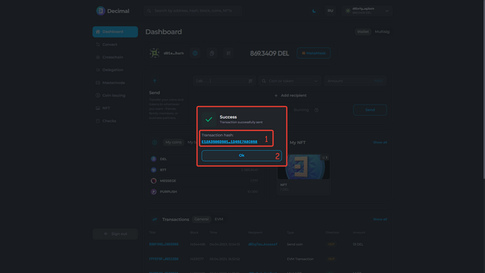 - 8. Burning toggle. When enabled, it allows you to send the transaction to a burning address, where coins or tokens will be irretrievably removed from the Decimal blockchain.