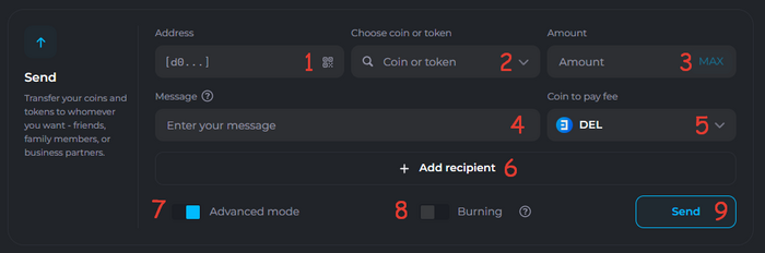- 7. Advanced mode toggle. When enabled, it allows you to add a message to the transaction and select a coin to pay the fee.